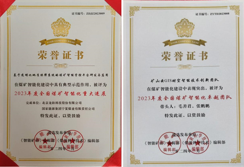 龍軟科技受邀參加會議并獲得兩項榮譽,其中“基于透明化地質保障系統的煤礦智能管控平臺研發與應用”被評為2023年度全國煤礦智能化重大進展,“礦山云GIS時空智能技術創新團隊”被評為2023年度全國煤礦智能化卓越團隊。
