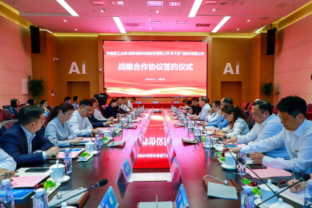 安徽理工大學科研部負責人劉輝,龍軟科技董事、副總經理高志譽,科大訊飛副總裁、安徽大區總經理李紅明分別代表三方簽約。中國工程院院士、安徽理工大學黨委副書記、校長袁亮,北京大學教授、龍軟科技董事長毛善君,科大訊飛董事長劉慶峰等出席并見證簽約。