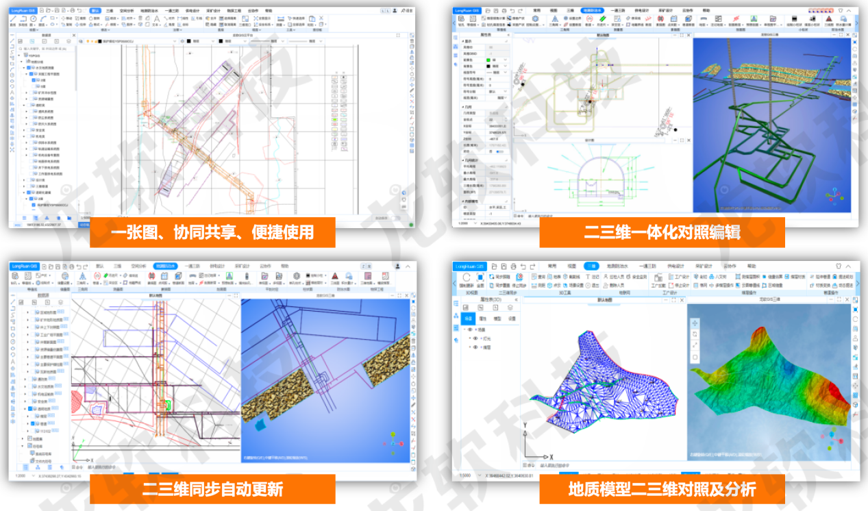 二三維一體化處理:基于云端同源數(shù)據(jù),提供同屏、雙向同步的二維、三維一體化應(yīng)用,自動構(gòu)建礦山巷道、煤層、構(gòu)造、鉆孔等各類三維模型,提供二三維同步跟隨、對照編輯、自動更新等便捷應(yīng)用。