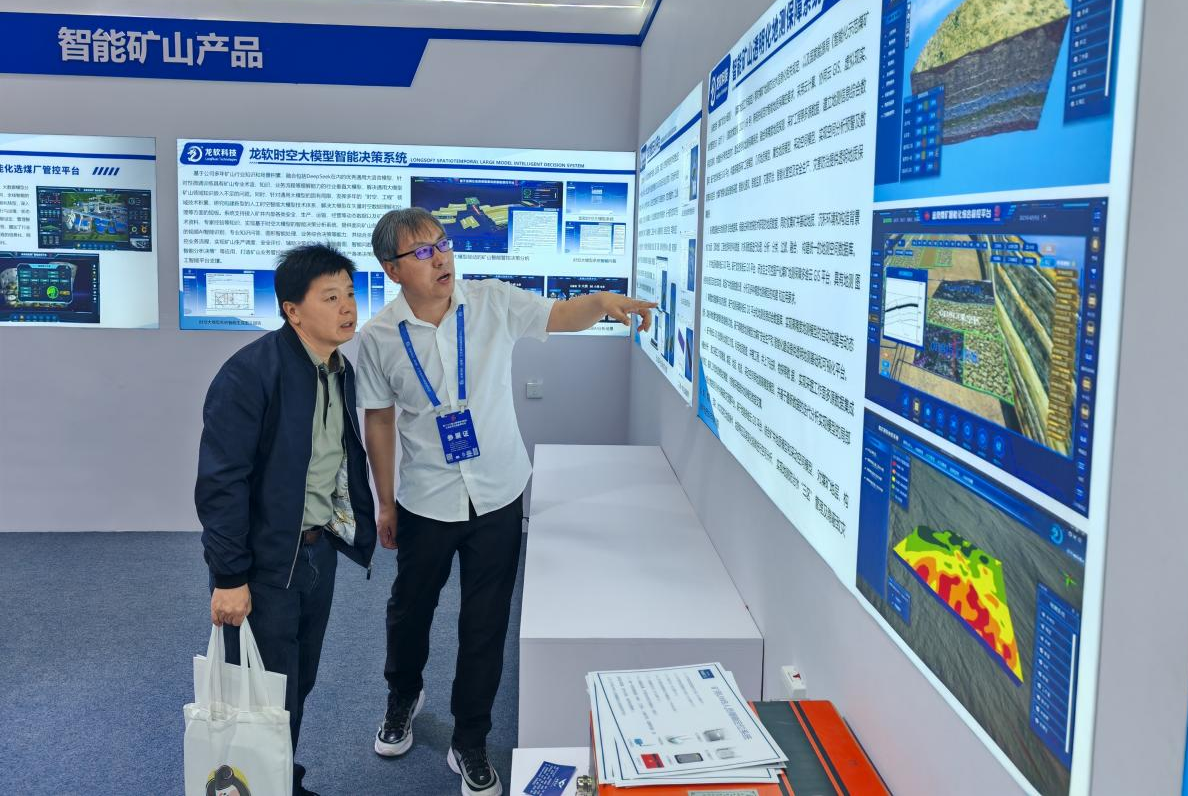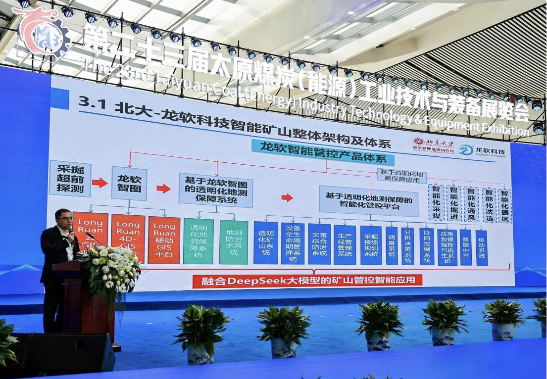 在展會期間,公司副總工程師兼智能礦山安全技術(shù)研究院院長景超先生,應邀在煤炭綠色智能開采技術(shù)交流活動中作了題為《高級智能化煤礦建設發(fā)展戰(zhàn)略思考和系統(tǒng)設計》的專題報告。景超院長在報告中深入闡述了龍軟科技與北京大學團隊在智能化煤礦建設領(lǐng)域的創(chuàng)新成果與實踐經(jīng)驗,提出了構(gòu)建高級智能化礦井的6626工程,并展示了團隊在礦山時空大模型、煤礦裝備智能化、地質(zhì)測量透明化、數(shù)據(jù)分析在線化、智能系統(tǒng)集成化、控制協(xié)同化以及生產(chǎn)過程綠色化等方面取得的卓越成就;并重點介紹了基于人工智能時空大模型的智能決策技術(shù),以及該技術(shù)在地質(zhì)保障系統(tǒng)、智能管控平臺、調(diào)度決策支持系統(tǒng)等方面的落地應用。