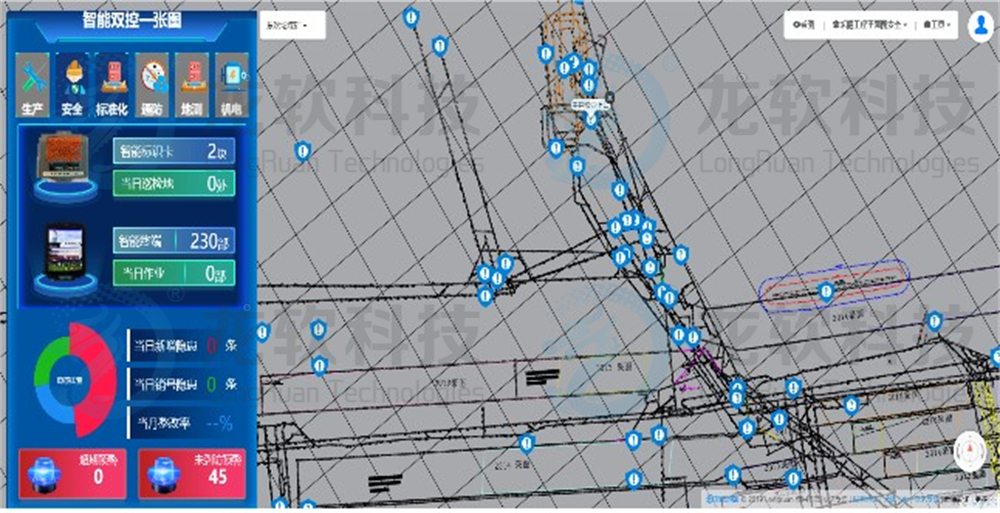 (1)安全雙控一張圖。實現風險、隱患四色分布,圖中定位展現;排查人員軌跡,可查詢、可追溯;報警提醒,風險點漏檢、隱患超期自動報警;沙盤式管控。